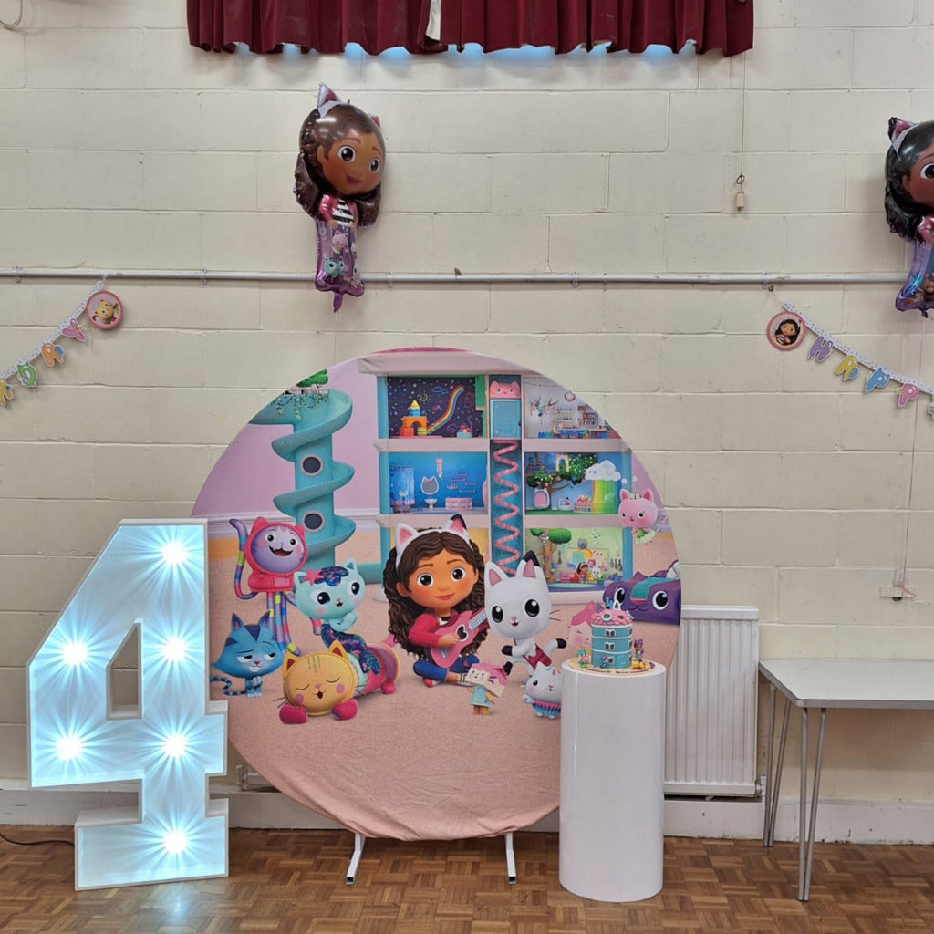 Enhance your Gabby's Dollhouse themed party with our stunning 6ft Round Backdrop Hoop. This eye-catching addition serves as a fantastic statement piece, offering a vibrant focal point that will delight guests of all ages.