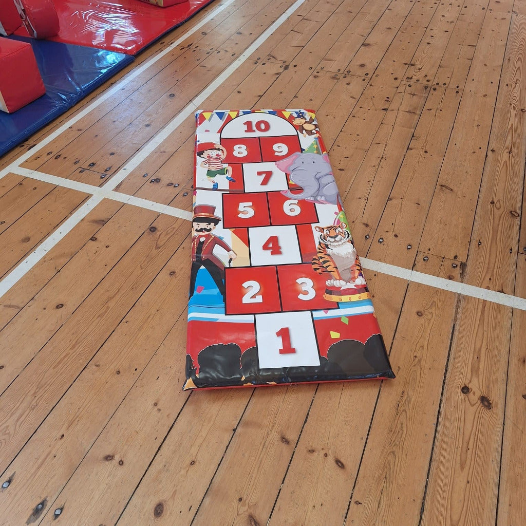 This easy-to-play game invites participants to jump and hop along the vibrant themed mat numbered from 1 to 10.