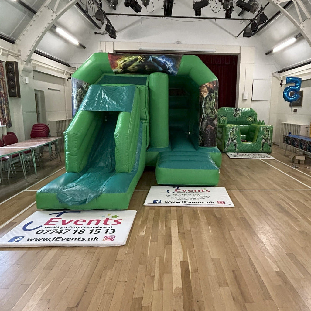 Transform your next party into a vibrant celebration with our Green Bounce 'n' Slide Castle and Inflatable Ball Pool combo! The Hulk Smash bouncy castle features a fun slide on the front, making it the perfect centerpiece for any themed event. Measuring 18ft x 21ft, this inflatable is adorned with an array of delightful Hulk artwork, ensuring hours of fun for children of all ages.