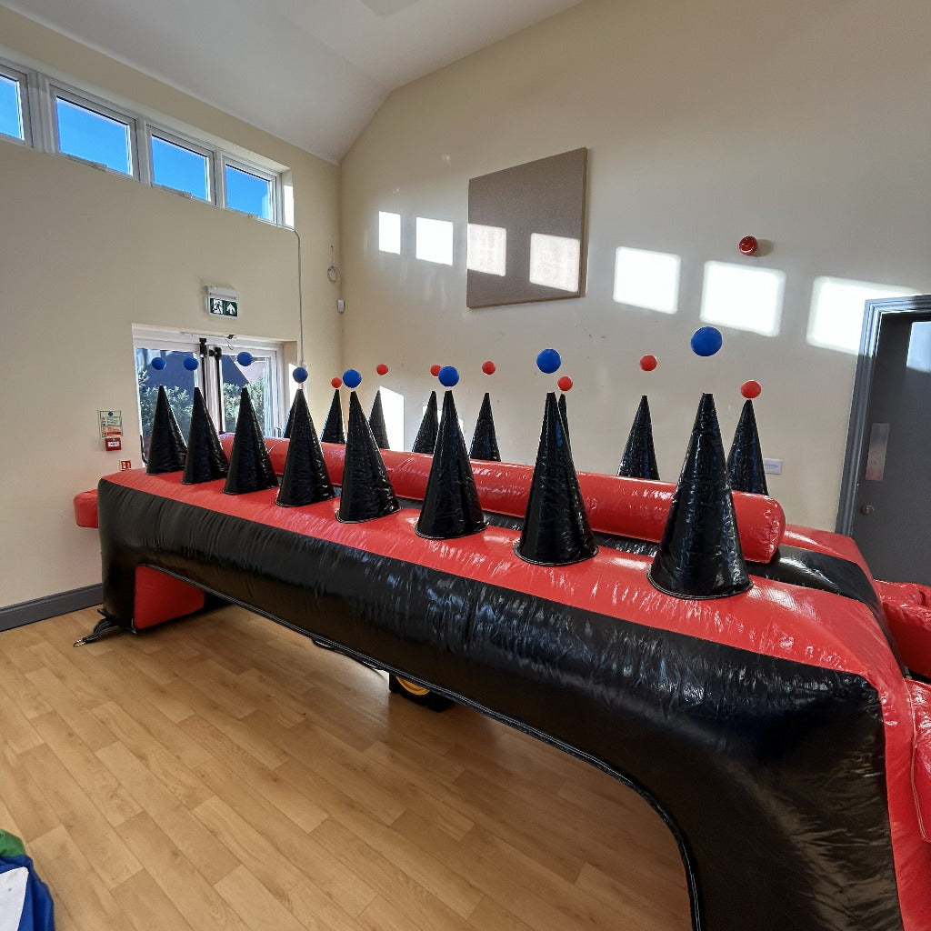 Our Red & Black Inflatable Air Juggler Game, to go head to head or team up to juggle the ball via air flow cone by cone from one end to the other in to the basket to win.